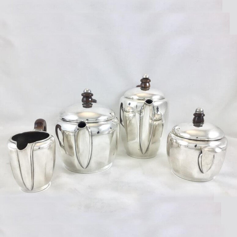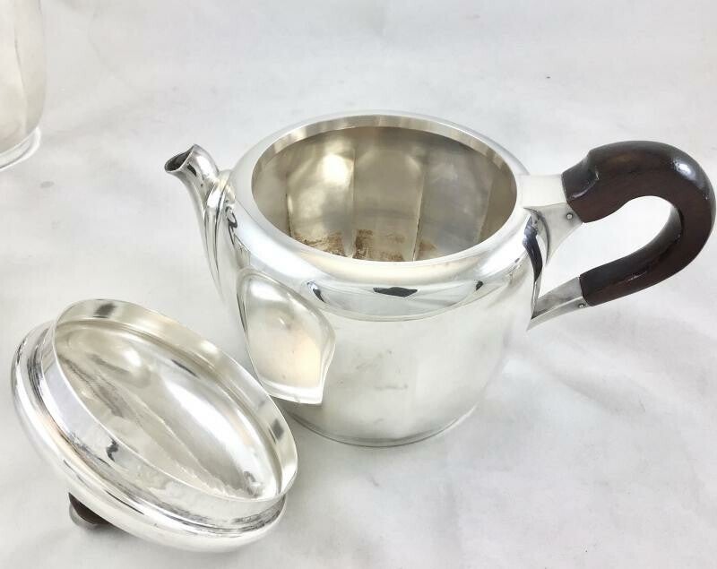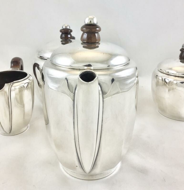 🇬🇧 Very beautiful Art Deco style tea and coffee set from the famous Brussels workshops of the Wolfers family. Handles and fretel in solid mahogany. Very robust and heavy.
