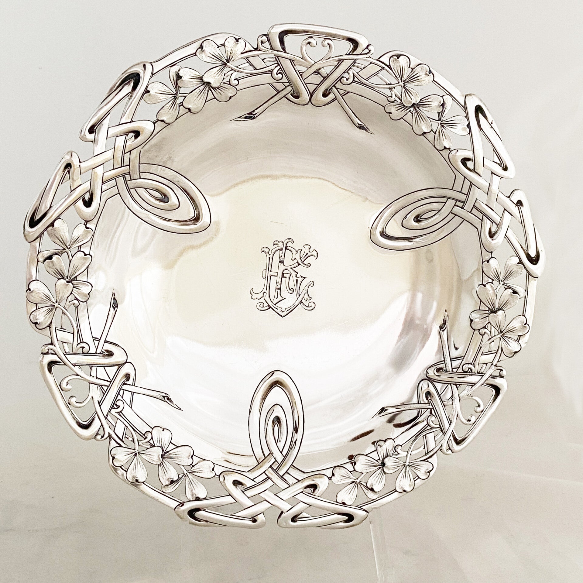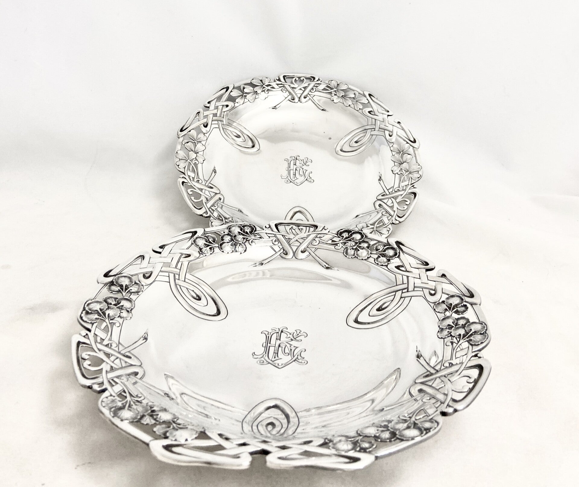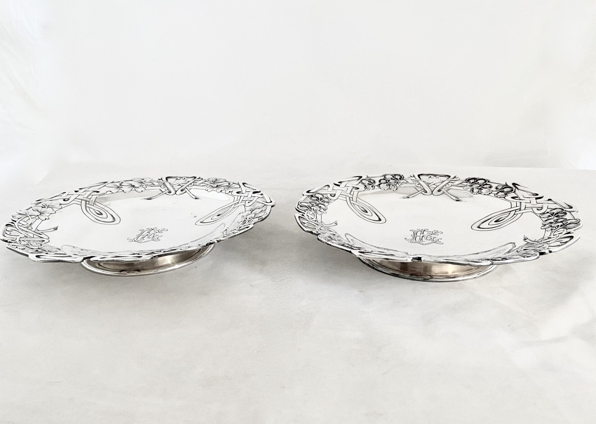 🇬🇧 Very elegant pair of biscuit or pastry presentation dishes from the Art Nouveau period. They are from the workshop of the famous Parisian goldsmith Alphonse Debain. Multiple decorative plant elements typical for this turn of the century. They are engraved with an “EK” monogram