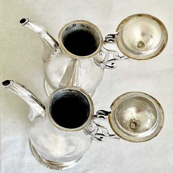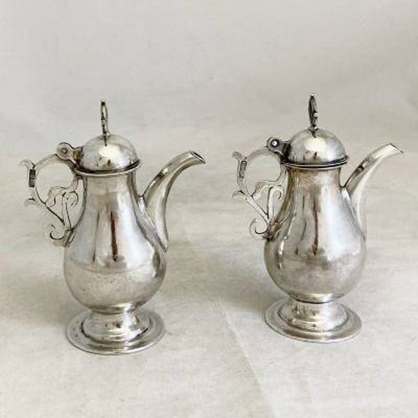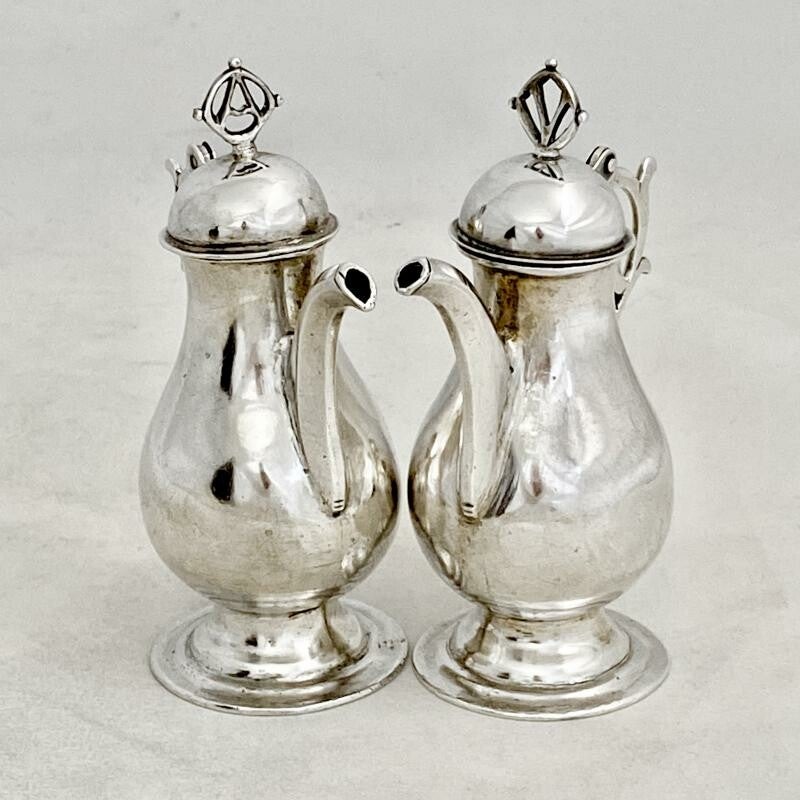 🇬🇧 Extremely rare pair of cruets from the 1680-1730 period, very probably Spanish. They are very heavy, as is often the case with the Iberian production of this period. The lids are topped with an A (Aqua) and a V (vinum). One of the two lids was later redone as shown in the photo.