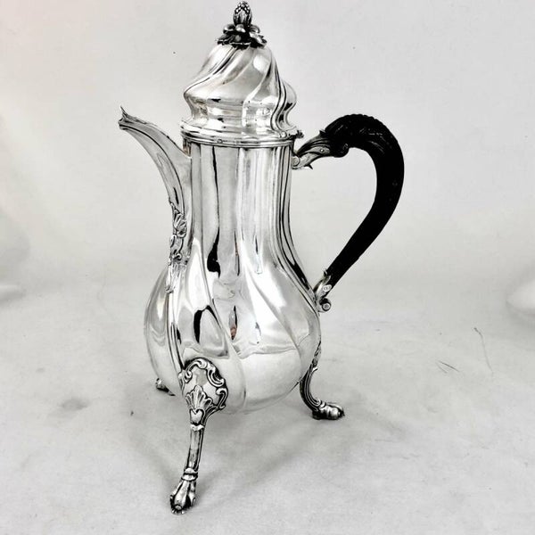 Majestic period coffee pot in Louis Quinze style in sterling silver. It has a fully twisted body and the rocaille patterned spout follows the same movement. The carved pear-wood handle is probably the original one and is delicately carved with decorations that already announce the Louis XVI style. The dome of the cover is quite high and is topped with a fretel in "burst seed" surrounded by abundant foliage. These arched feet are attached to the body by a magnificent baroque cartouche and end in a lion's paw.