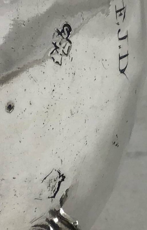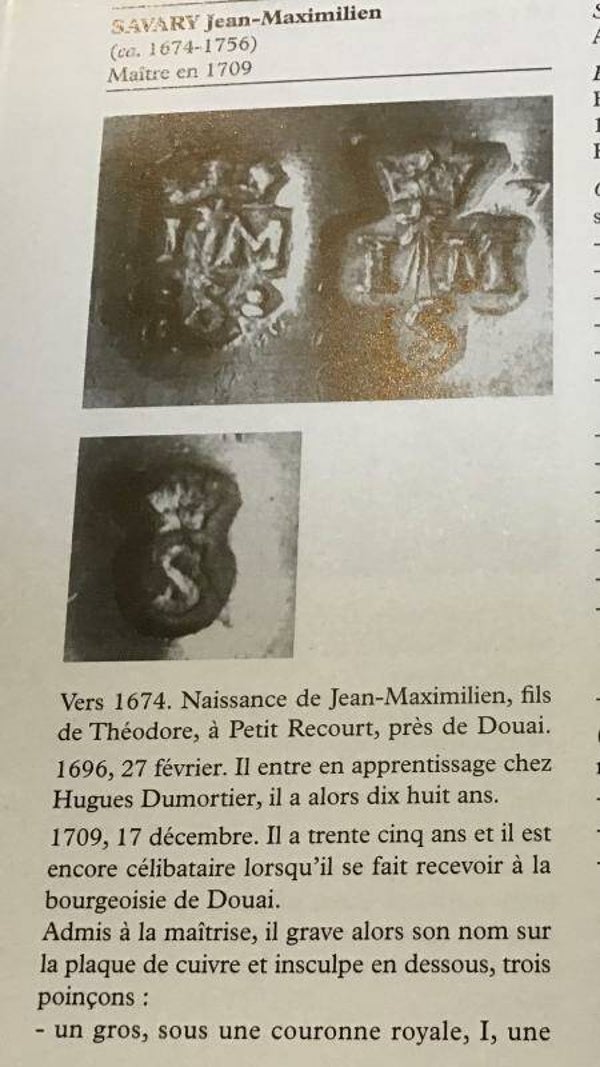 Son poinçon de maître figure sur l'intérieur du couvercle et sur le fond. Sur le fond on devine également deux autres poinçons de Douai mais ils sont plus effacés. La verseuse a quatre pieds? plutôt que trois, comme c'est souvent le cas à Douai.