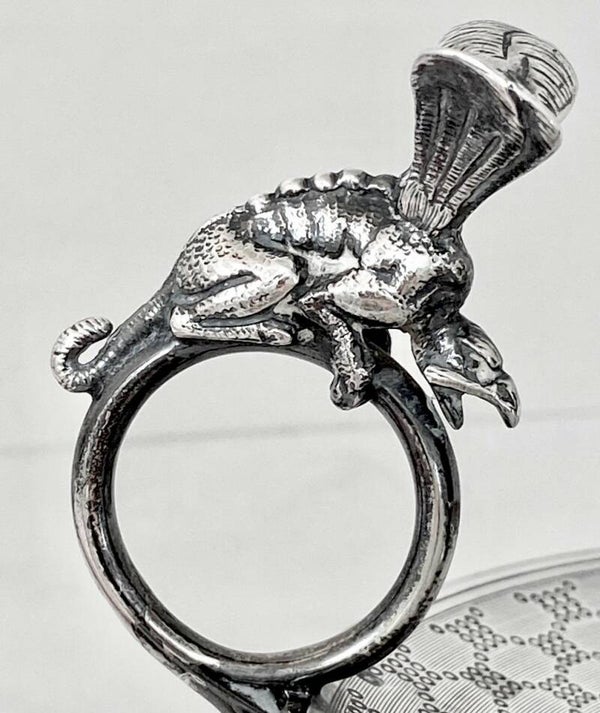 Singulier bougeoir à main en argent massif guilloché d'époque Napoléon III, la anse est ornée d’une petite chimère