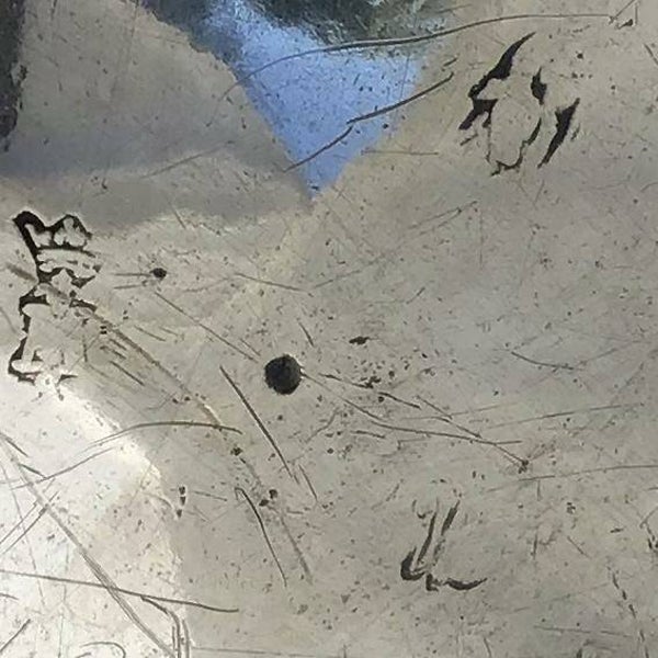 Il s'agit du poinçon de charge de la généralité de Metz (un M en ‘ronde’) et un sanglier de face accompagné du millésime. Elle a exactement les mêmes pieds qu'une autre cafetière de Catherine Millet vendue chez Couteau-Begarie le 27/02/98. Plusieures pièces de cette femme-orfèvre sont repris dans l'excellent ouvrage ´L'orfèvrerie des Ardennes´du dr. Thierry Mulette.
