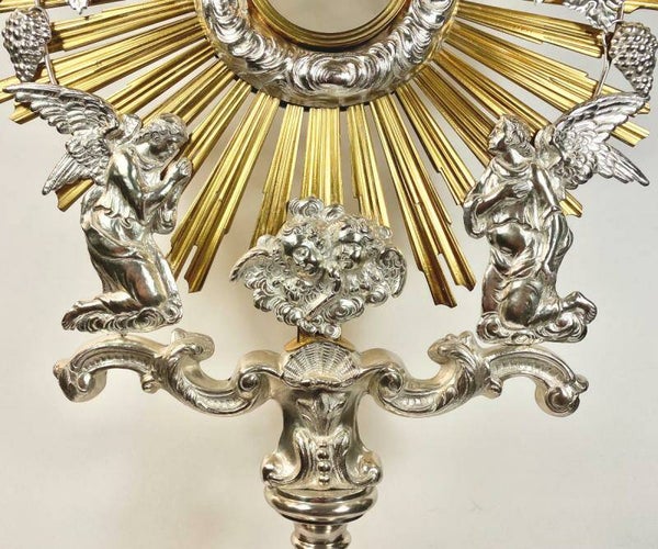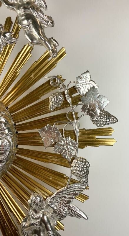 🇫🇷 Majestueuse monstrance en argent massif de style baroque datant du milieu du XIXe siècle. Décoré de vignes, épis de blé et d'angelots, son style est tout à fait dans la tradition de la deuxième moitié du XVIIe siècle et du début du XVIIIe siècle.