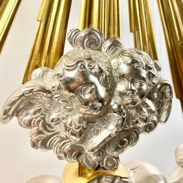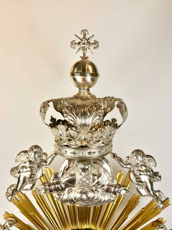 Majestic monstrance in baroque style dating from the mid-nineteenth century. Its style is very much in the tradition of the second half of the seventeenth century and the beginning of the eighteenth century. It is decorated with vines, ears of wheat and cherubs. It is crowned with a crown which forms a canopy above a representation of God the Father who is surrounded by a cloud. The rays of the sun are executed in gilded bronze for reasons of solidity. An exceptionally detailed monstrance. Provenance: Treasure of the franciscain monastery of Bruges where after a four century long presence, the last friars have left the town.