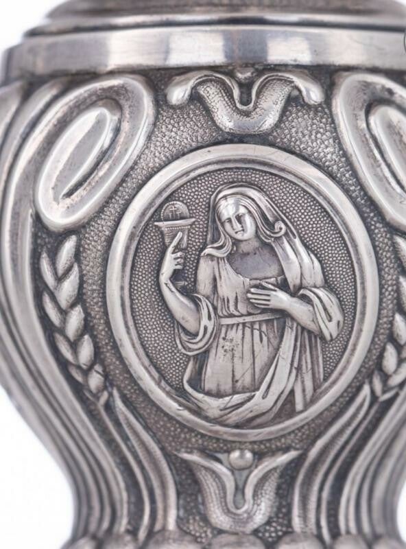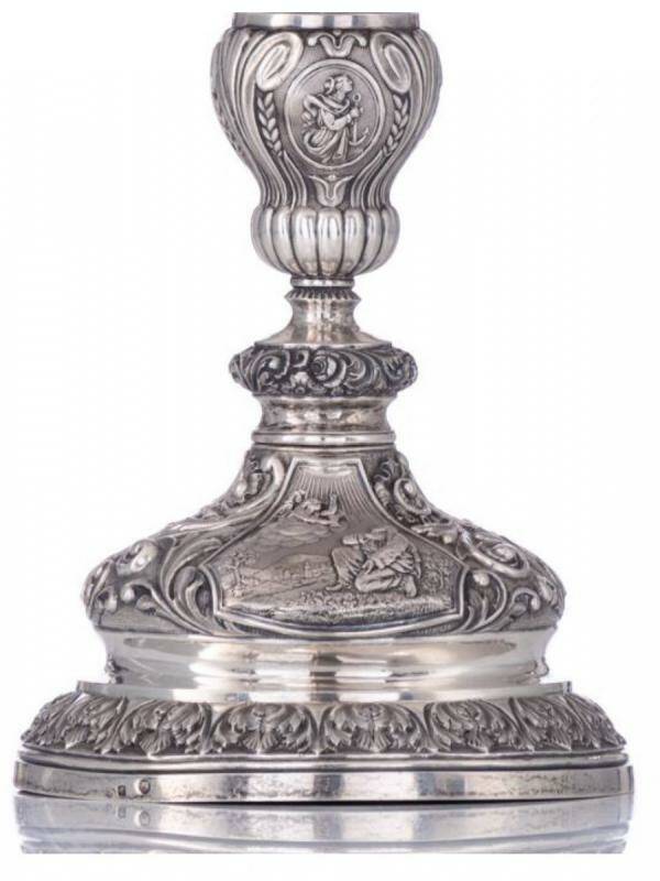 🇬🇧Majestic Charles X style ciborium in solid silver, Belgian hallmarks for the period 1831-1868. It is of exceptional finesse and quality. It is decorated with several cartouches in embossed and chiseled silver. Each cartouch represent small narrative scenes from the Gospels. Weighs over a kilo.