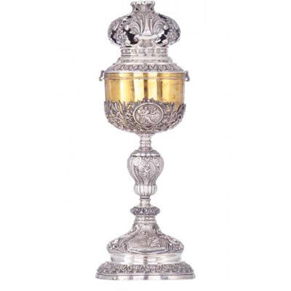 Il est d'une finesse et qualité exceptionnelle. Il est décoré de plusieurs cartouches représentant des scènes de l’évangiles. Le ciboire est en argent repoussé et ciselé et pèse plus d'un kilo.