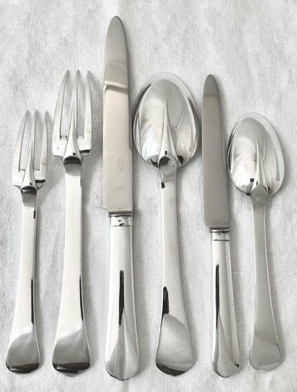 🇳🇱Schitterende Art Deco bestek van de beroemde Parijse goudsmid Jean E. Puiforcat in massief zilver van de eerste titel. Het is geïnspireerd op het 'rattenstaart' bestek uit de zeventiende eeuw, maar is op meesterlijke wijze aangepast en herontworpen in de art-decostijl van het interbellum. Op het bestek is geen monogram gegraveerd.
