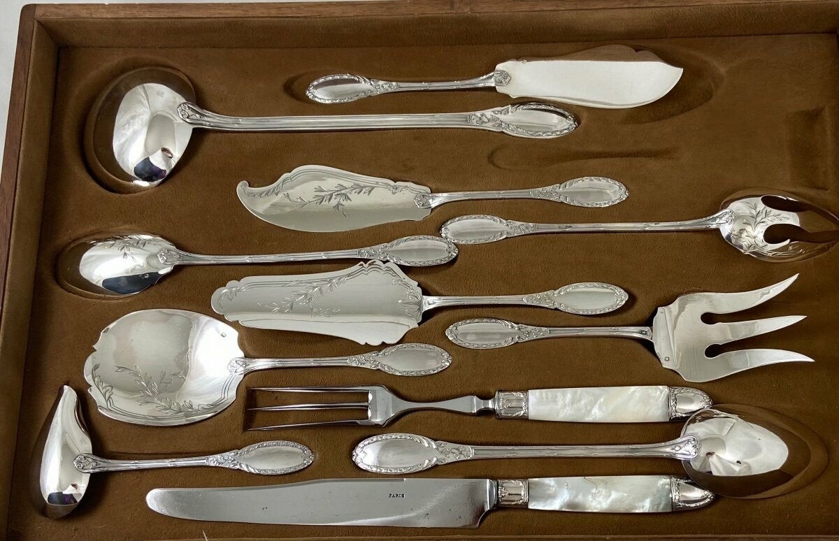 🇫🇷 Très élégante ménagère de couverts en argent massif de style Louis XVI comptant 150 pièces pour 12 convives.