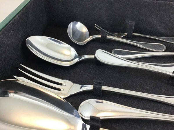 🇬🇧Very nice set of cutlery "Albi" by Christofle, complete for 12 guests. They are in almost new and completely complete condition. 128 pieces in all. There are: 12 large knives, 12 large forks, 12 large spoons, 12 dessert spoons, 12 dessert forks, 12 dessert knives, 12 fish forks, 12 fish knives, 12 teaspoons, 12 cake forks, 8 pieces to serve.