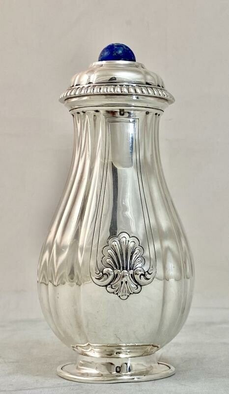 🇫🇷 Ravissant saupoudroir à sucre de style Régence en argent massif surmonté d'une pierre lapis lazuli.