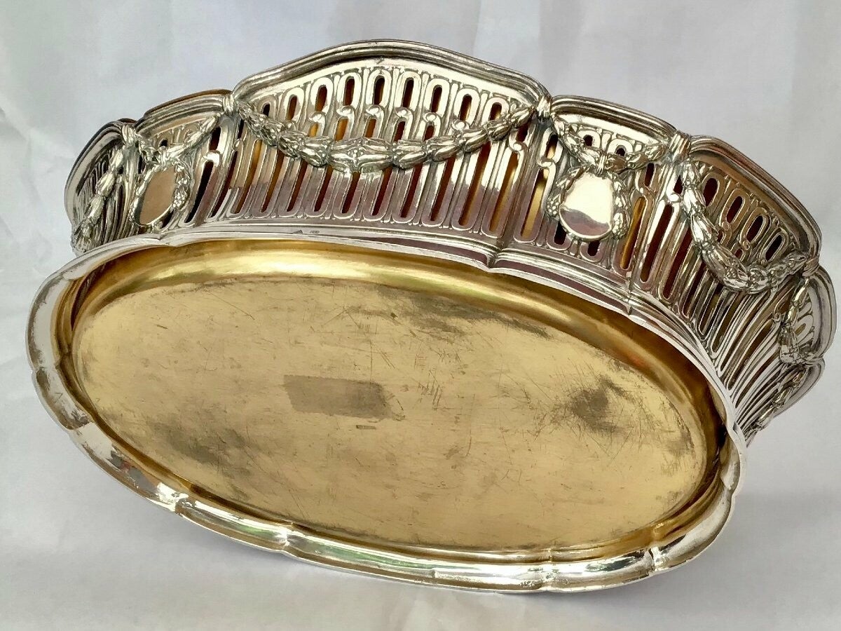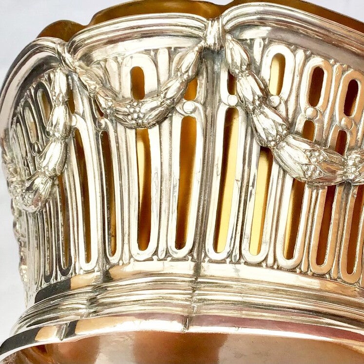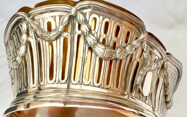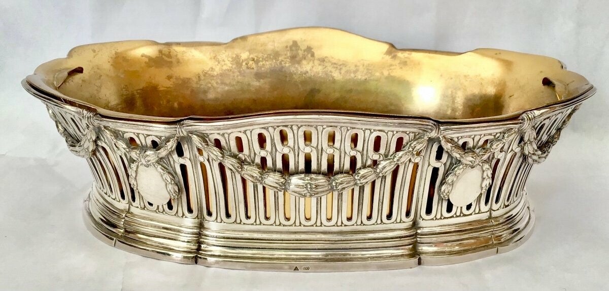🇬🇧Lovely Louis XVI style jardiniere from the prestigious Wolfers workshops who were the most prestigious jeweler-goldsmith's in the Belgian capital for more than a century. Several generations of great artists and creators succeeded each other at the head of this legendary company to which the royal museums of art and history have dedicated an entire room. Very elegant, this centerpiece features the Louis Seize style in a very refined way, alternating openings, laurel garlands and ribboned medallions. It weighs 560 grams without its golden brass interior.