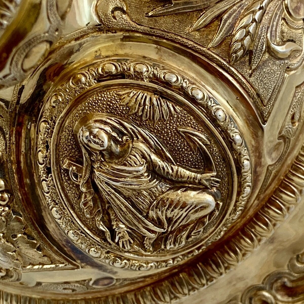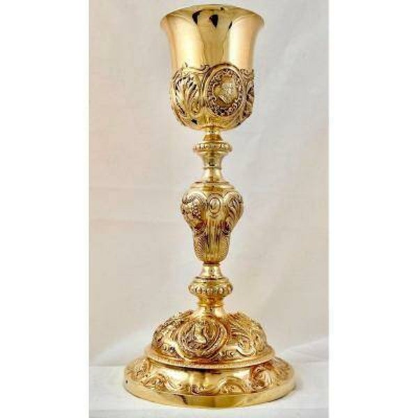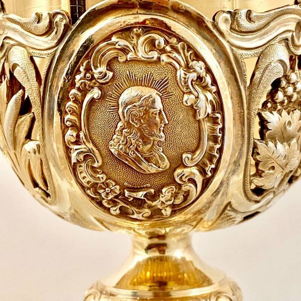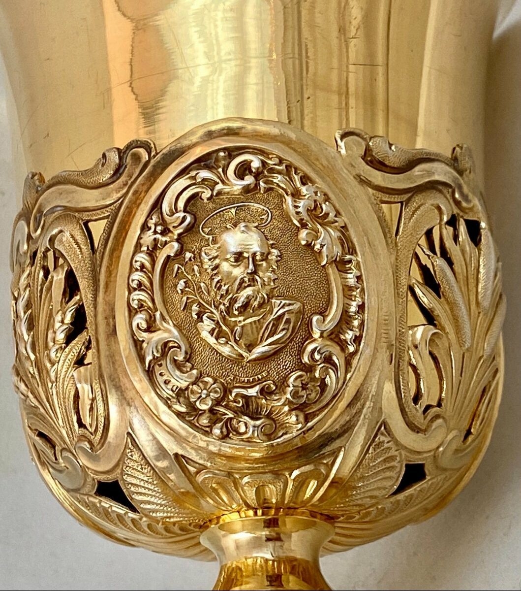 Artist(s) - Hallmarks : Sumptuous chalice in gilded sterling silver dating from the mid-nineteenth century. Abundantly decorated with hand-embossed motifs. It is fully in the tradition of chalices from the late Louis XVI period. The cup is decorated with three medallions in which respectively appear Christ, Saint Joseph and the Virgin Mary. In the three medallions decorating the foot, we find the allegories of the three theological virtues: Faith, Love or Charity and Hope as mentioned in the first letter of Saint Paul to the Corinthians. The Hymn to Charity is probably one of the most beautiful texts in Christendom and has inspired hundreds of artists over the centuries. The chalice is completely covered with a layer of gold in fairly good condition.