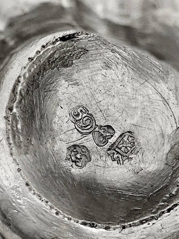 A l'intérieur du pied on trouve la striche ou la trace de la prise d'argent et les quatre poinçons réglementaires de la ville de Bruxelles. Il est d'assez grande taille pour l'époque.