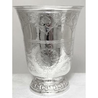🇳🇱Tulpvormige beker. De hele beker is subtiel gegraveerd met gestileerde plantenmotieven in een verfijnd spel van mat en glanzend. De gravure is in zeer goede staat en is nog versleten nog vervaagd. Keurmerk van de stad Parijs en letter T datum gekroond voor 1782.