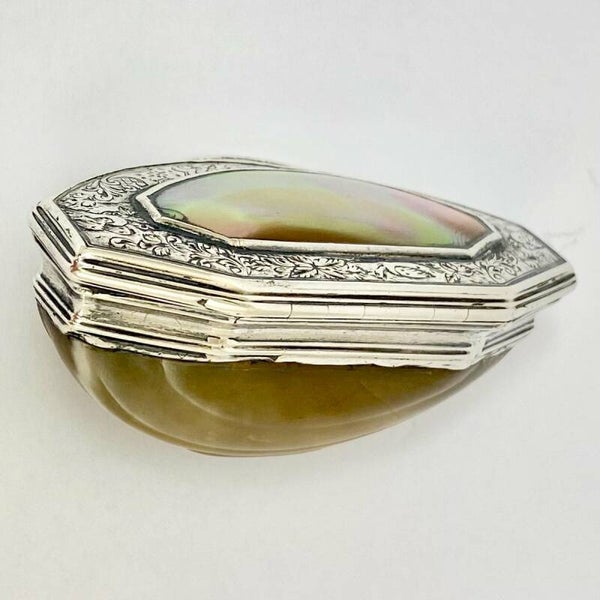 🇳🇱Mooie snuifdoos in zilver en schelp. Gegraveerd met plant- en eendmotieven. Geen keurmerken, waarschijnlijk Duits of Oostenrijks-Hongaars werk uit de eerste helft van de negentiende eeuw. Rond 1840.