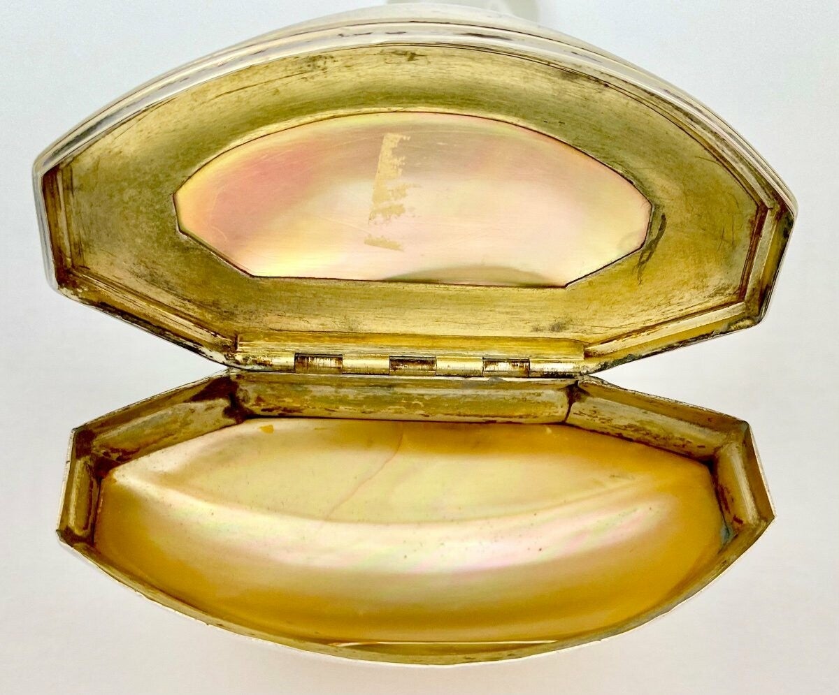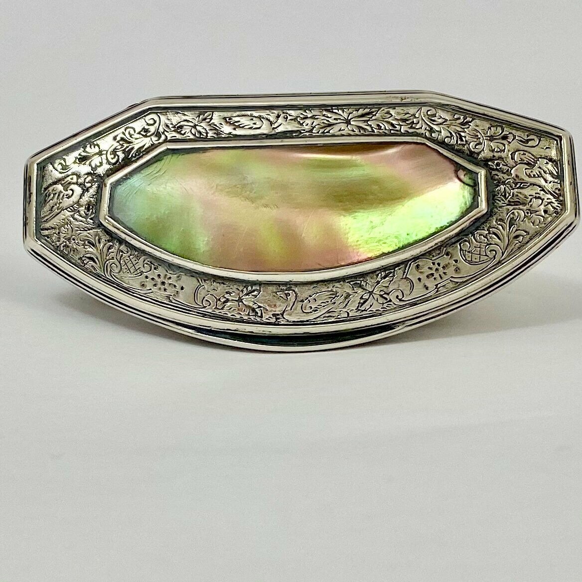 🇫🇷Jolie boîte à priser en coquille montée argent et gravée de motifs végétaux et canards.