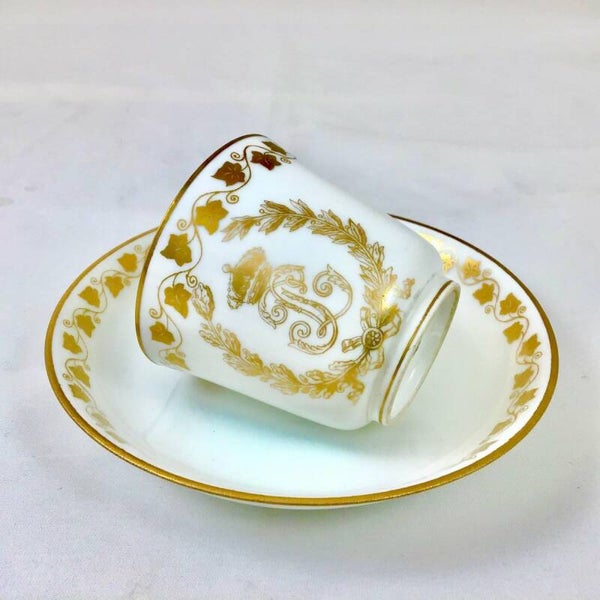 🇳🇱Mooi paar Sèvres porseleinen kop en schotels met het koninklijke monogram van Louis-Philippe van de servies der prinsen. Op de achterkant van de stukken staan de keurmerken van de Sèvres-fabriek en het Palais des Tuileries.