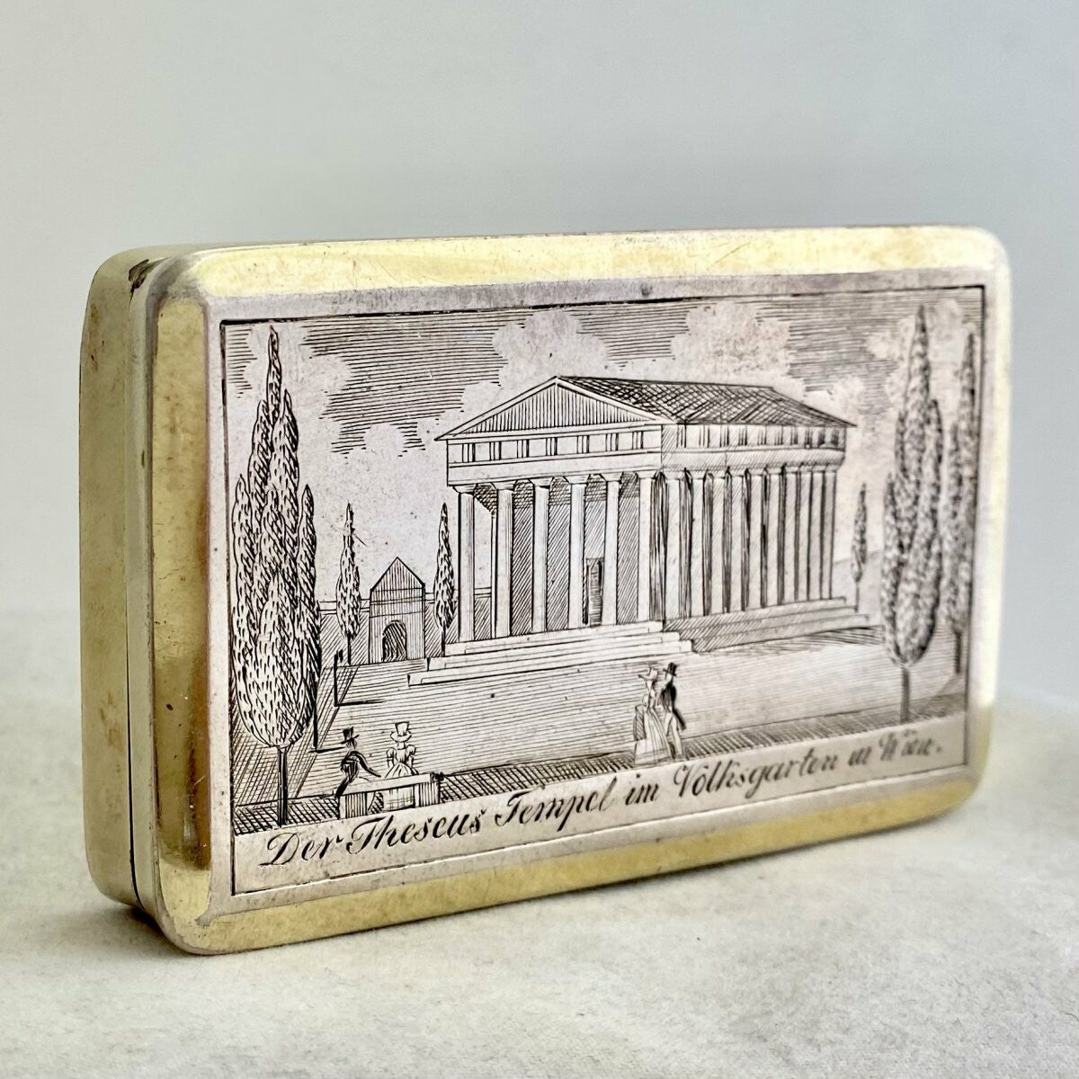 🇫🇷Rarissime boîte à priser néoclassique gravée d'une vue du Temple de Thesée à Vienne. Elle a probablement était fabriquée pour commémorer la construction de ce magnifique bâtiment viennois qui abrita jadis une des plus belle sculptures de Canova, le combat de Thesée, roi d'Athène, héros qui terrassa le minotaure.