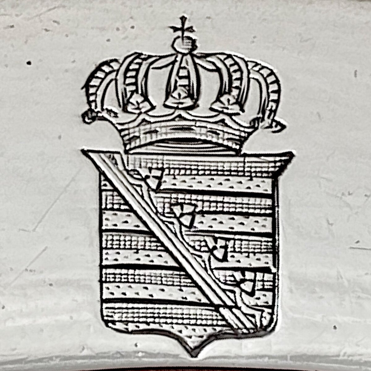 L'assiette est poinçonné de la garantie pour le royaume des Pays-Bas. Elle est simplement décorée d'un petit bord avec un motif discret typique pour son époque et est gravée du blason de la famille de Saxe sommé de la couronne royale.