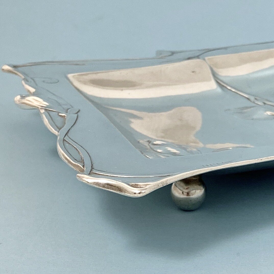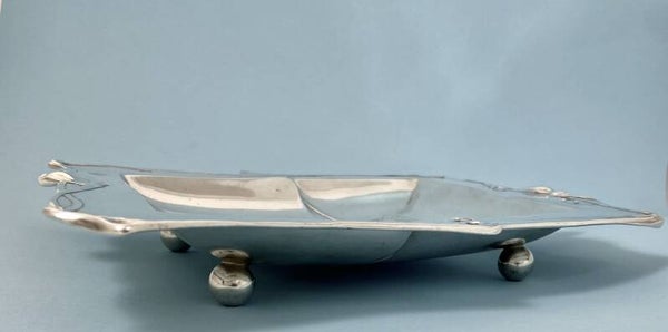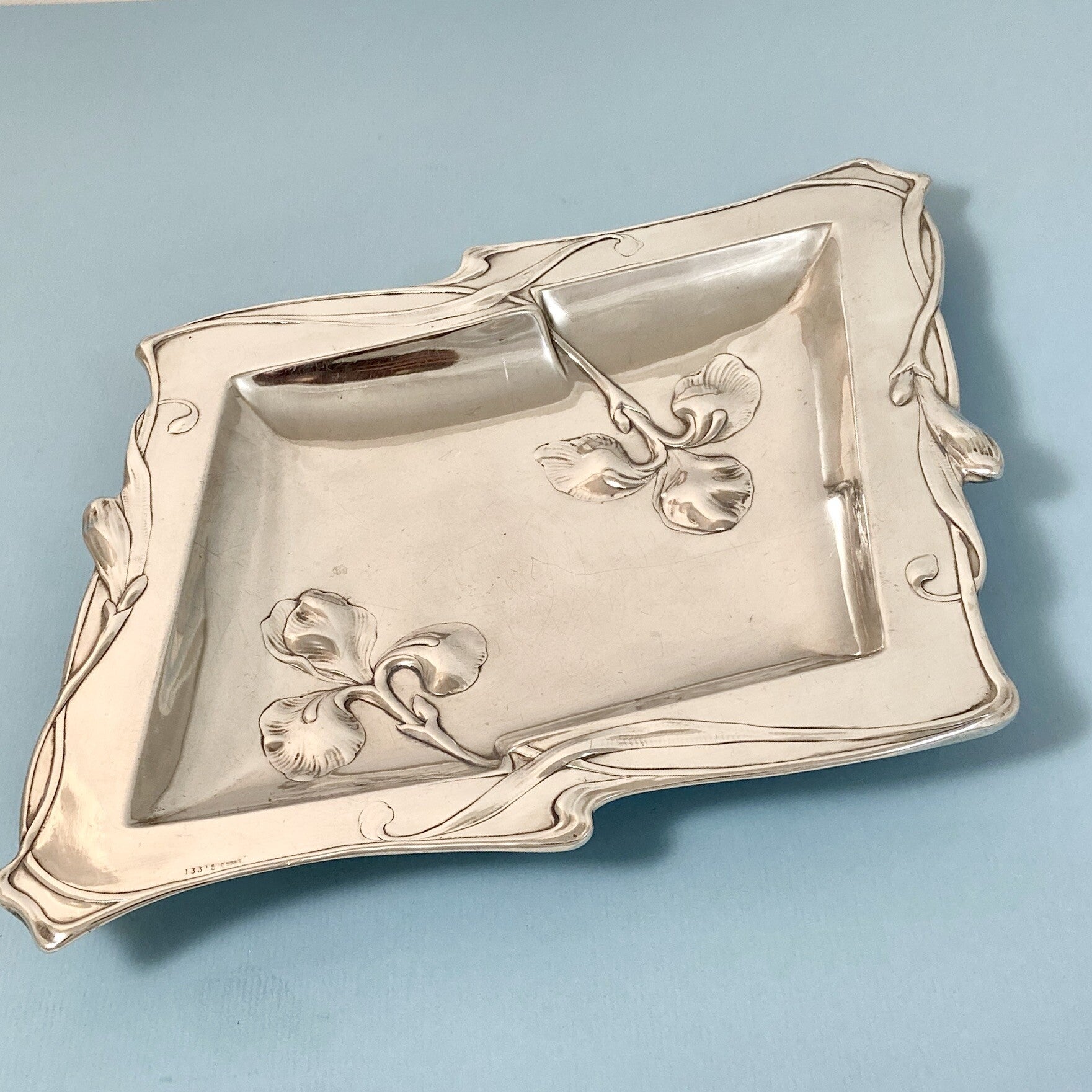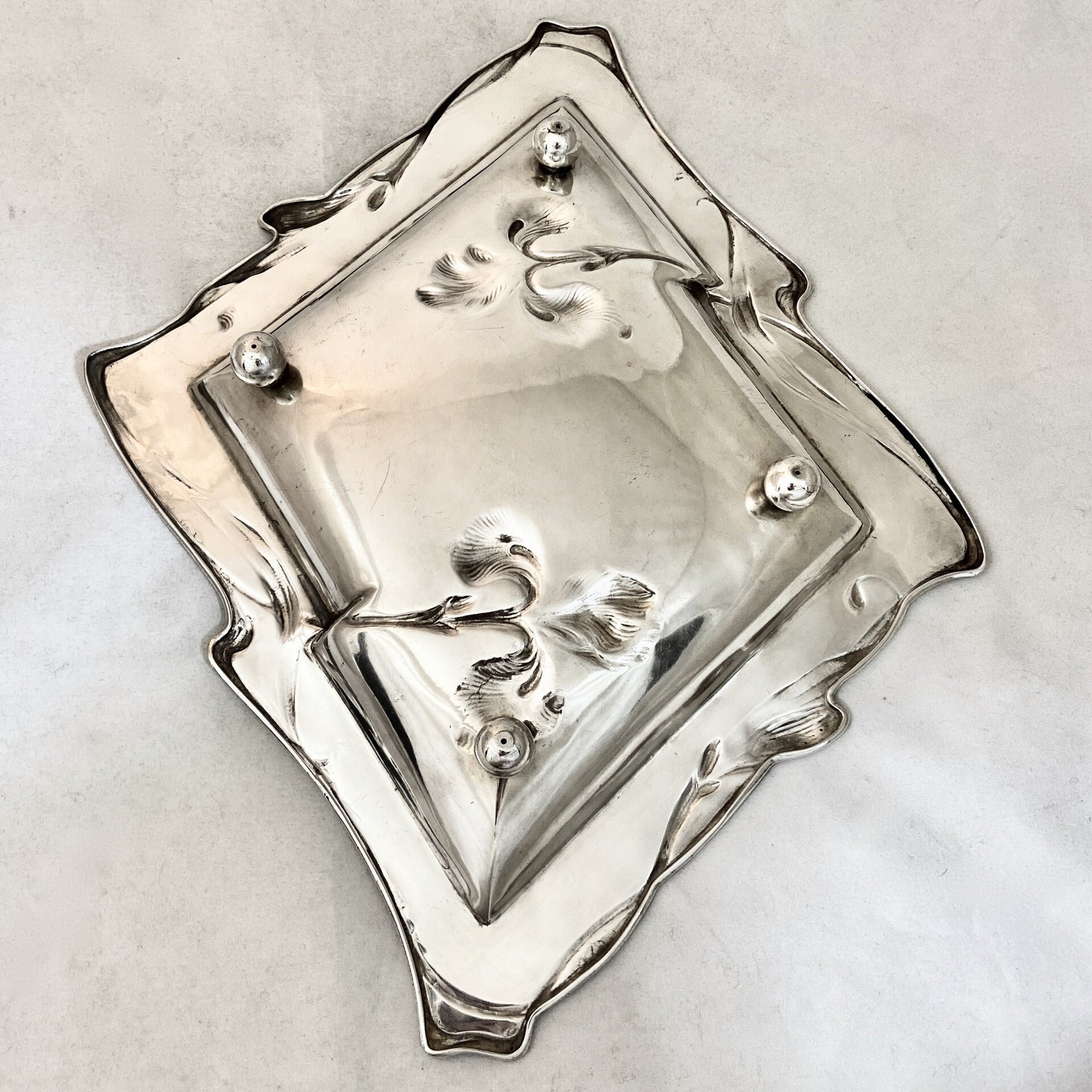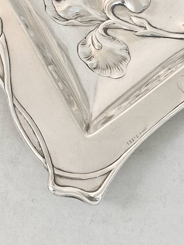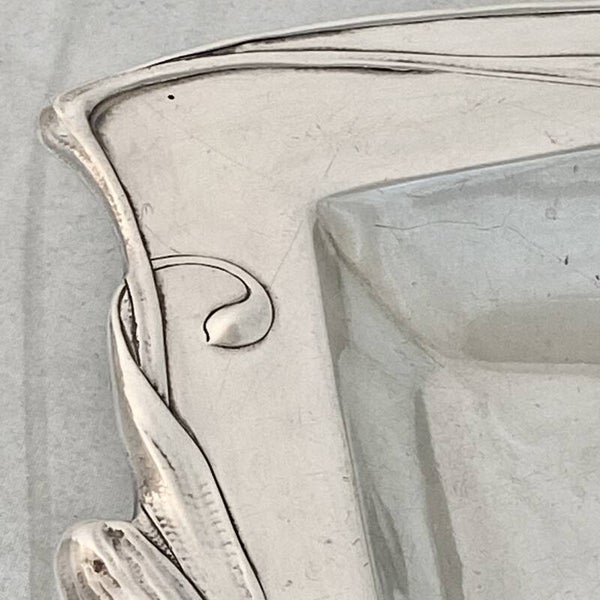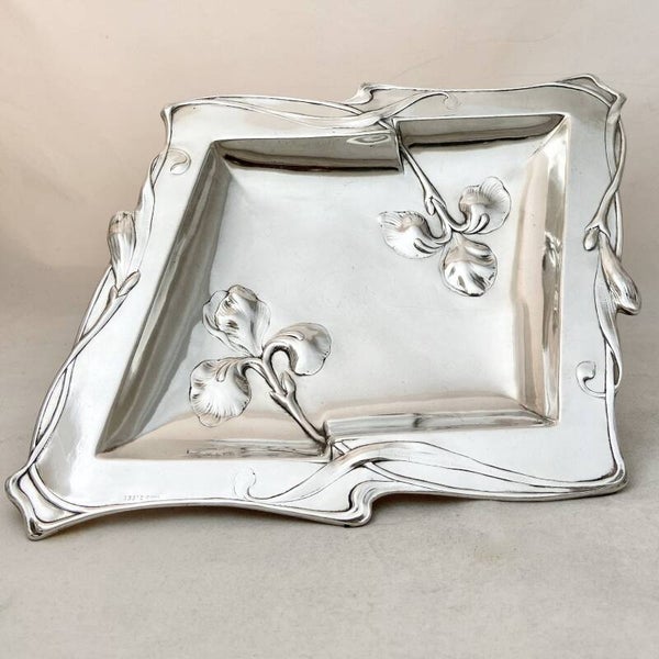 🇬🇧Exquisite Art Nouveau plate with hand crafted silver sculpted floral motifs dancing all around the rim and in the middle. Executed in the purest Art Nouveau style, the rhomboid tray is in solid silver of German origin.