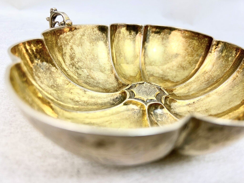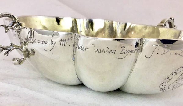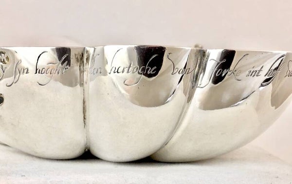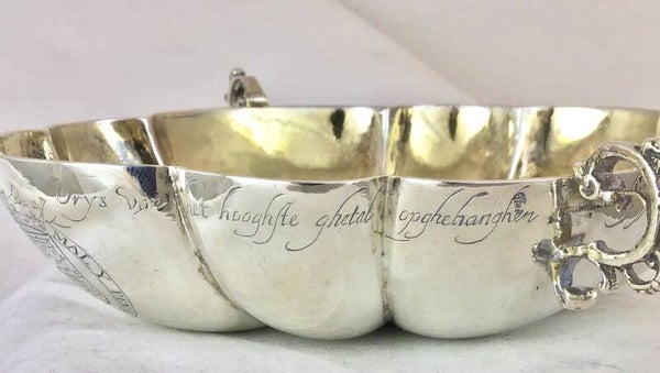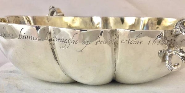 🇳🇱Vroeg 17e eeuwse zilveren meerlobbige brandewijnschaal met koninklijke herkomst in -gedeeltelijk verguld- zilver en vermeil. Deze schitterende drinkschaal werd in 1656 te Brugge geschonken door de toenmalige hertog van York -latere koning James II en broer van koning Karel II- aan de heer Vanden Bogaerd, winnaar van een schutterswedstrijd in de hof van Sint-Barbara. Ze draagt de keurmerken van de stad Augsburg en het meesterteken van Uriel Keesborer actief (1615-1623). Aan de buitenzijden bevindt zich het koninklijke wapen van de hertog van York en het devies van de Orde van de Kousenband:"Honi soit qui mal y pense" samen met een opschrift dat de omstandigheden van de schenking omschrijft. De scène werd trouwens in een gedicht beschreven door een tijdsgenoot en ooggetuige Ingelbrecht Cockuyt.