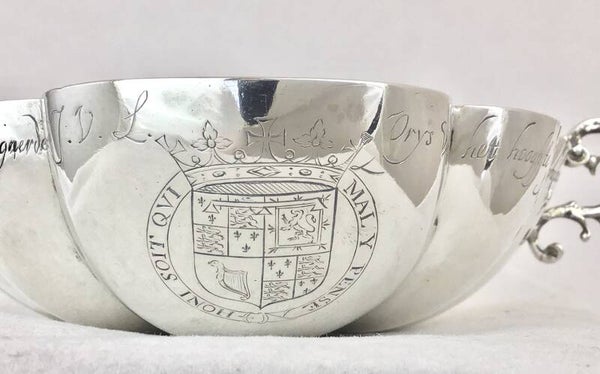 🇬🇧Exceptional parcel-gilt silver bowl with the hallmark of the master silversmith Uriel Keesborer, Augsburg, (1615-1623). This wine cup in a polylobed oval shape has a central medallion with the coat of arms of Drien vanden Bogaerde and has handles on both sides. It also features the coat of arms of the Duke of York, future King James II and brother of King Charles II, as well as the motto of the Order of the Garter: "Honi soit qui mal y pense". It was given in Bruges, in 1656, by the Duke of York to Mr. vanden Bogaerd, winner of a competition of the Guild of Archers. At the time the scene was described by an eyewitness an poet: Ingelbrecht Cockuyt, which you will fins at the bottom of this page.
