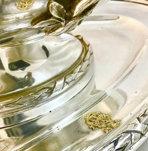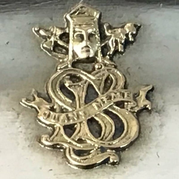 De part et d'autre de la saucière se trouvent sur le bord du dormant ses initiales en or massif rehaussées d'une banderole sur laquelle est écrit sa devise "Quand Même" . Devise qu'elle aimait repeter et qui fesait écho à son audace et au fait que la vie de théâtre était un mode de vie qui exigeait tout. Tout comme la vie valait la peine d'être vécue à fond. Les initiales sont sommées d'un masque de théâtre grec, d'un glaive et d'une marotte.