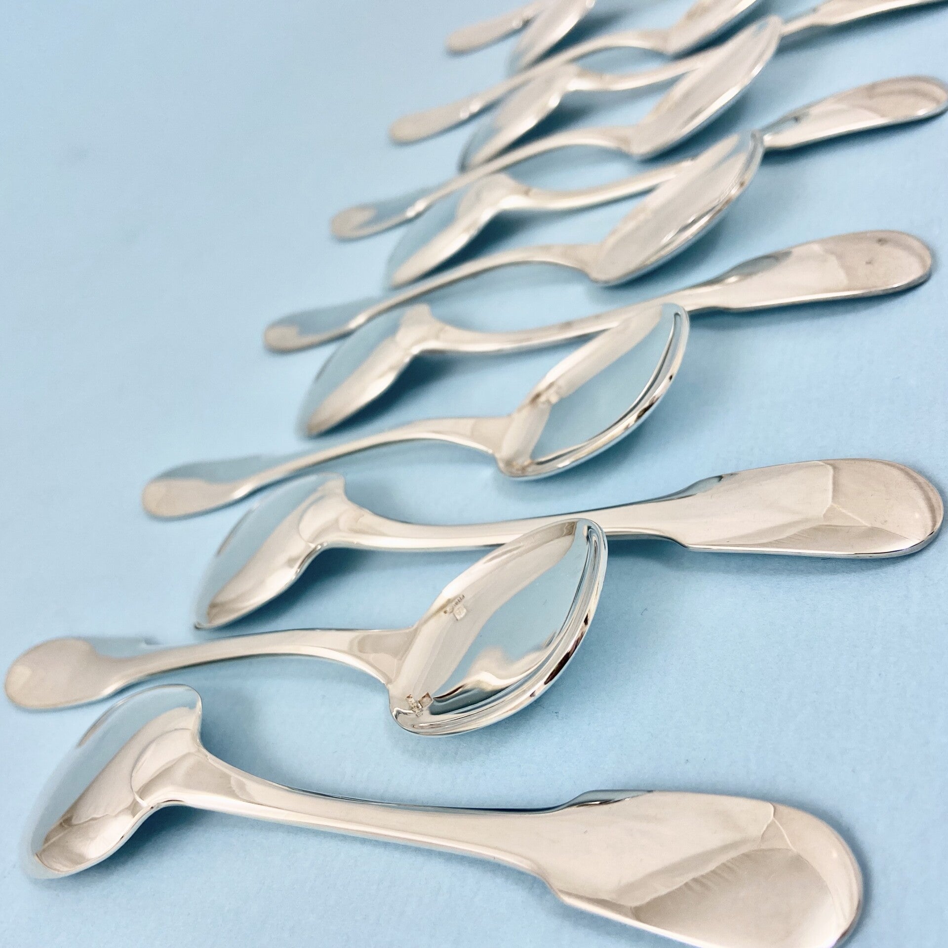 🇫🇷 Ravissante série de douze petites pelles ou cuillères à glace ou sorbet d'inspiration Louis XIII, modèle Cluny, de la maison Christofle. Etat comme neuf.