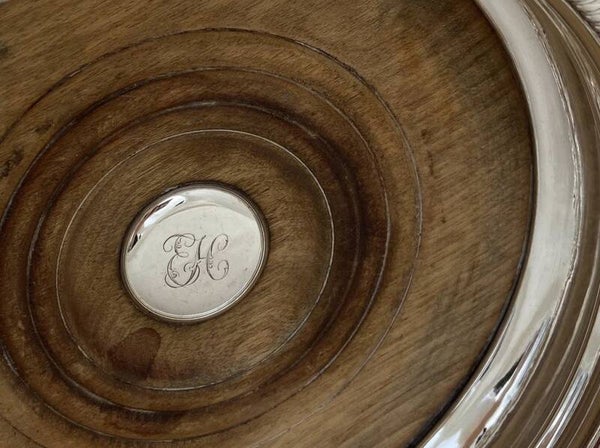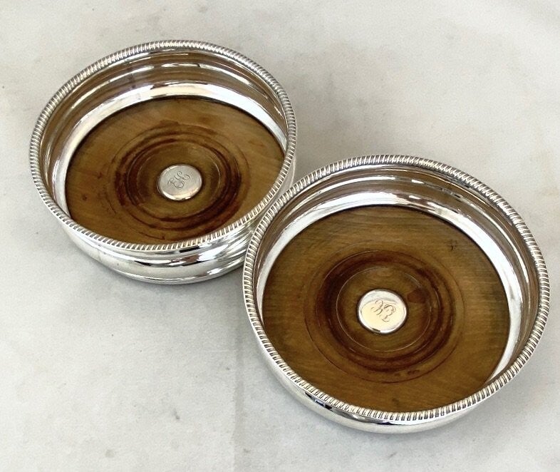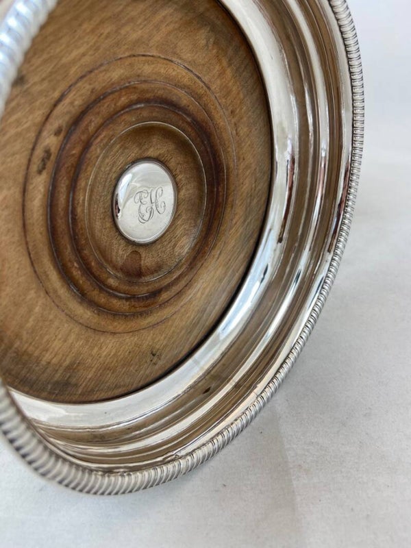 🇬🇧Extremely rare pair of Georges IV wine coasters in sterling silver (925 ‰). Sheffield hallmark 1805. Mahogany backs are still original. In the middle of these wooden trays is a silver pastille with an EH monogram. Weight of the pair (gross): 480 grams. Price for the pair.