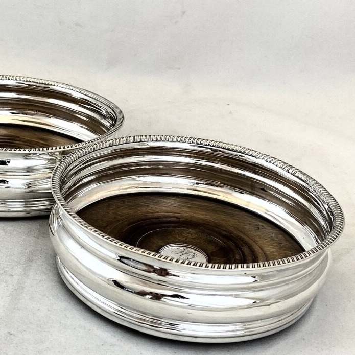 🇫🇷 Rarissime paire de porte-bouteilles Georges IV en argent massif (925‰). Poinçon de Sheffield 1805. Les fonds en acajou blond sont encore d’origine. Au milieu des ces fonds en bois se trouve une pastille an argent avec un monogramme EH.