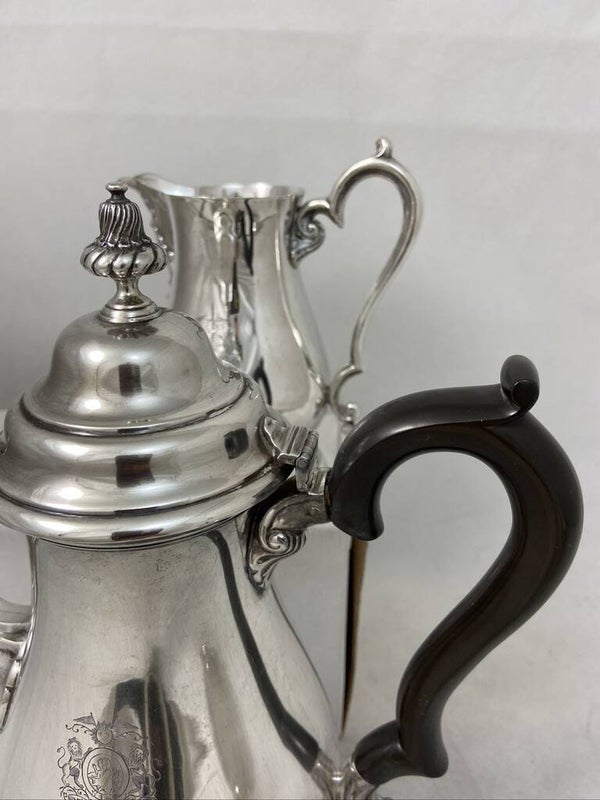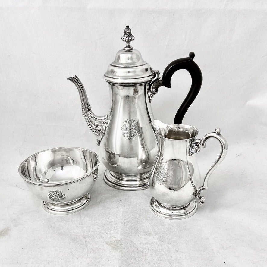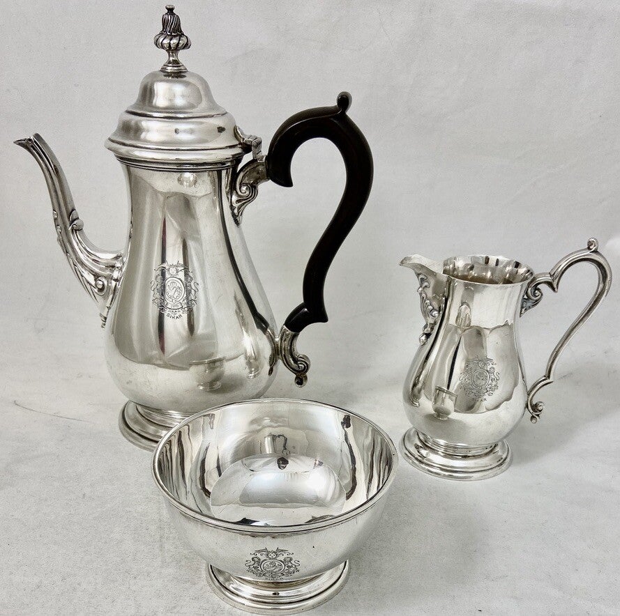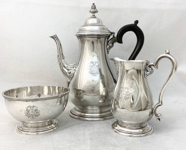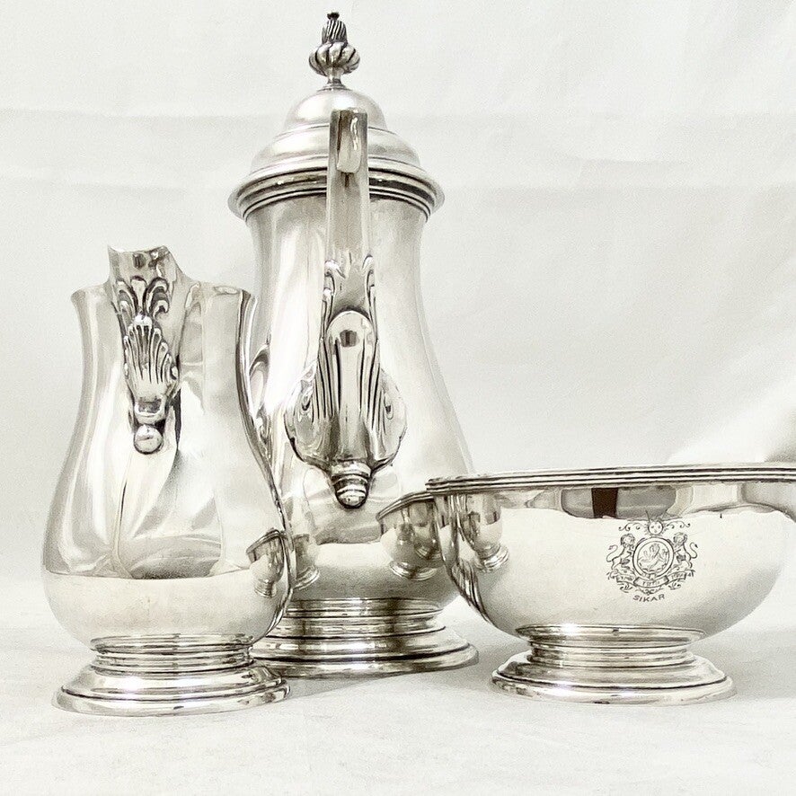 🇫🇷Étonnant et ravissant service à café de style George III en argent massif, provenant du trésor du 11ème et dernier roi ou "Rao Raja" de Sikar, dans l'état du Rajastan au nord de l'Inde. les trois pièces sont gravées des armes royales.