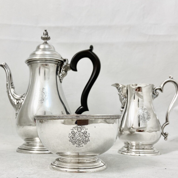 🇬🇧Astonishing and charming, George III style, coffee service in solid silver, from the treasury of the 11th and last king or "Rao Raja" of Sikar, in the state of Rajastan in northern India. All the three pieces are engraved with the royal arms. Kalyan Singh Bahadur was born in 1886 and succeeded his uncle in 1922. After the independence of India, like all the other Maharajas, he had to give up his royal power and died in 1967. Later, a member of the royal family of Sikar became Vice-President of India from 2002 to 2007.