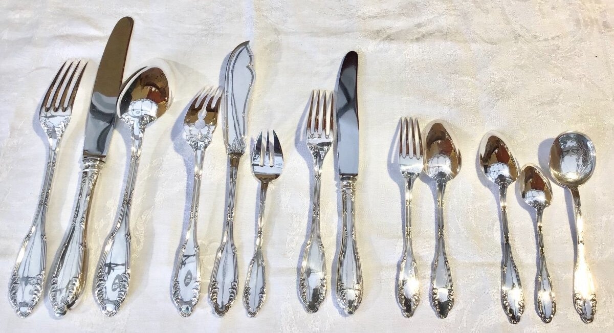 🇫🇷 Très grande ménagère de style Louis XVI en argent massif pour douze convives comptant plus de 170 pièces.