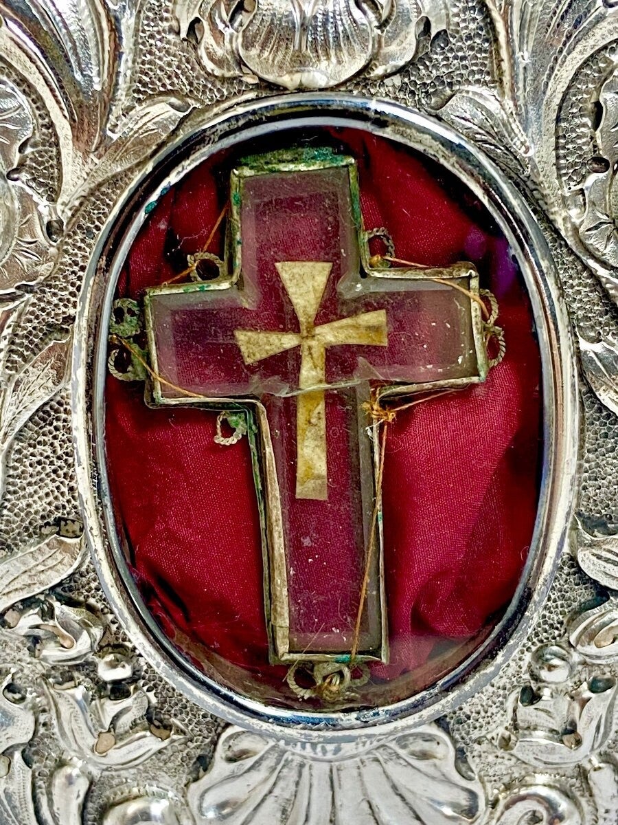 🇬🇧 Extremely rare osculatory reliquary or kiss of peace in sterling silver dating from the seventeenth century. According to its technical characteristics, style and decoration, it is to be attributed to a Flemish or French goldsmith around 1650. The object is still in perfect condition and contains a relic, probably dating from the same period. This relic is contained in a small cross formed of two cruciform plates in rock crystal. They are unfortunately split but are perfectly solidified by the gilt threads that bind them together. Also in the cartouche containing the relic is a red wax seal with the arms of an unidentified bishop which was probably attached to the relic at first. This form of rock crystal cross was traditionally used to contain - very small - parts of the True Cross but no element allows me to confirm it for this reliquary.