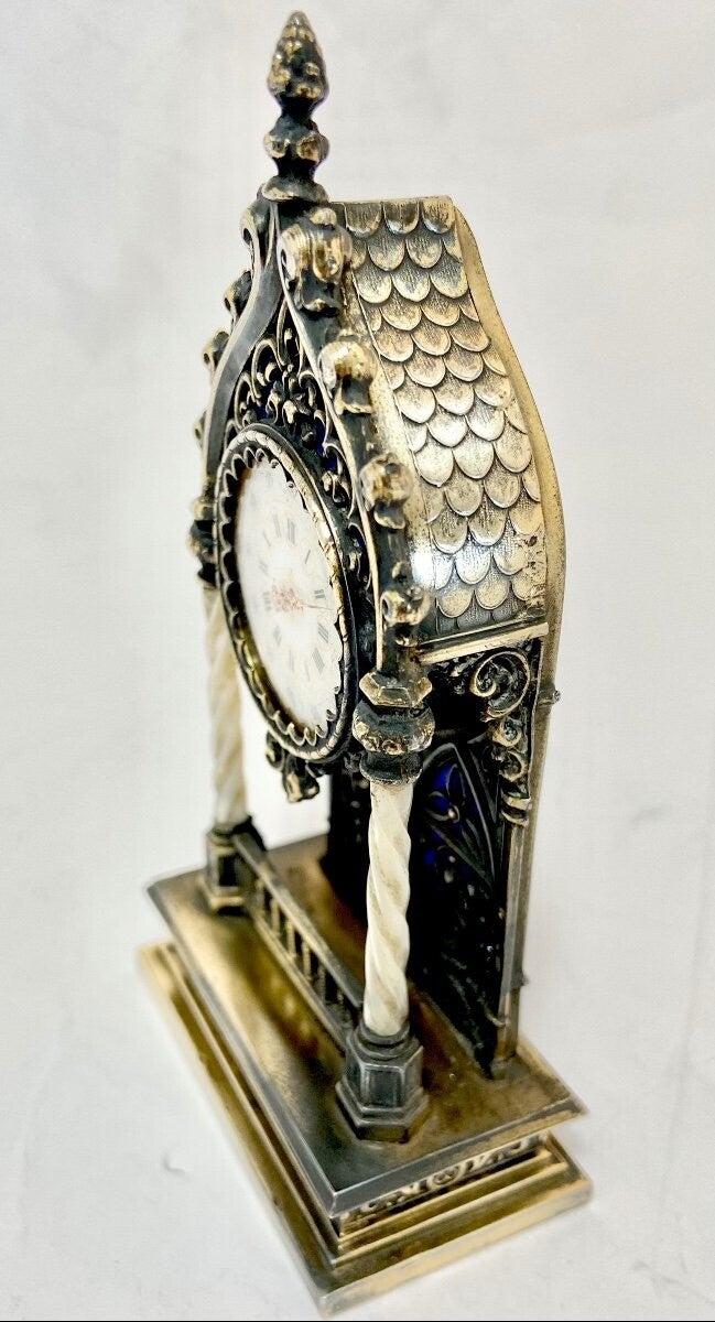 🇬🇧 Lovely little bedside clock in gilded and enamelled solid silver. The goldsmith executed it in the neo-Gothic style or "cathedral style" as his contemporaries called it. The royal blue enamel is in perfect condition and has no chips. The watch mechanism can be easily dismantled and can be removed through the small door at the back to allow cleaning with liquid or rinsing with water. The entire surface of this object of virtue is covered with a thick layer of gold. The key to wind the watch is behind the mechanism. We cannot guarantee the working condition of the watch but it can be wound with the key. The two twisted columns on the front are in mother-of-pearl and are intact.